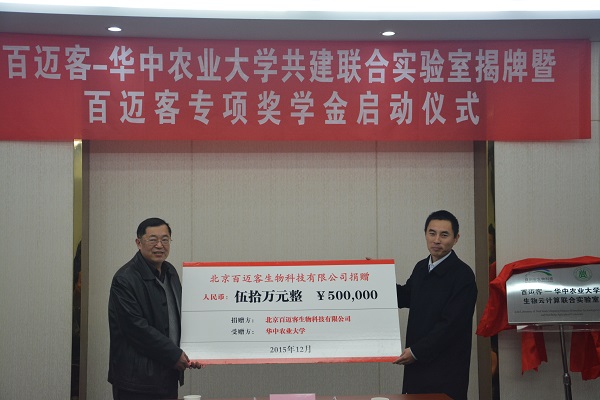 在商用云計(jì)算平臺(tái)成功上線后,百邁客啟動(dòng)了云平臺(tái)戰(zhàn)略又一重大舉措-全國(guó)重點(diǎn)區(qū)域的布點(diǎn)及人才隊(duì)伍建設(shè)。2015年12月1日 ,“百邁客-華中農(nóng)業(yè)大學(xué)共建聯(lián)合實(shí)驗(yàn)室揭牌暨獎(jiǎng)學(xué)金頒發(fā)儀式”在華中農(nóng)業(yè)大學(xué)隆重舉行。