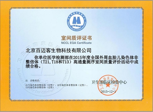 2015年12月 14日,百邁客醫(yī)學收到衛(wèi)生部臨床檢驗中心發(fā)來的室間質評證書,證書顯示百邁客醫(yī)學參加的“外周血胎兒染色體非整倍體(T21、T18、T13)高通量測 序室間質量評價活動中成績合格”,順利通過2015年度室間質評。表明百邁客在2015年11月的該項目室間質評再次獲得滿分,此前,在2015年5月的 室間質評中,該項目亦滿分通過。