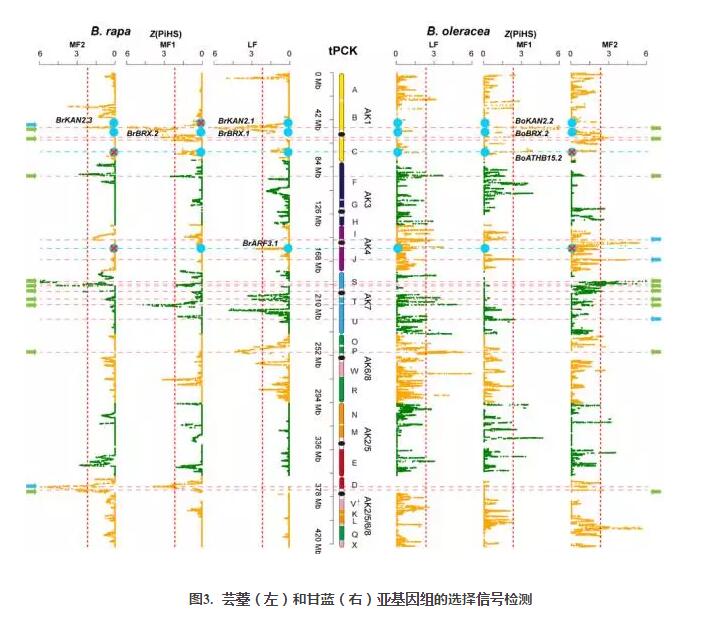 進(jìn)一步檢測古六倍體的亞基因組對蕓薹和甘藍(lán)結(jié)球性狀的平行或趨同進(jìn)化的影響,作者將兩個物種的基因組打碎成基因單元,再根據(jù)已知的祖先染色體核型,將上述 基因單元重排和串接,分別構(gòu)建出蕓薹的三個亞基因組一致序列和甘藍(lán)的三個亞基因組一致序列。重新進(jìn)行PiHS分析后,發(fā)現(xiàn)蕓薹的不同亞基因組之間存在4個 平行選擇信號的區(qū)域,甘藍(lán)存在4個;同時蕓薹和甘藍(lán)的相同亞基因組之間存在著15個受到趨同選擇的區(qū)域。