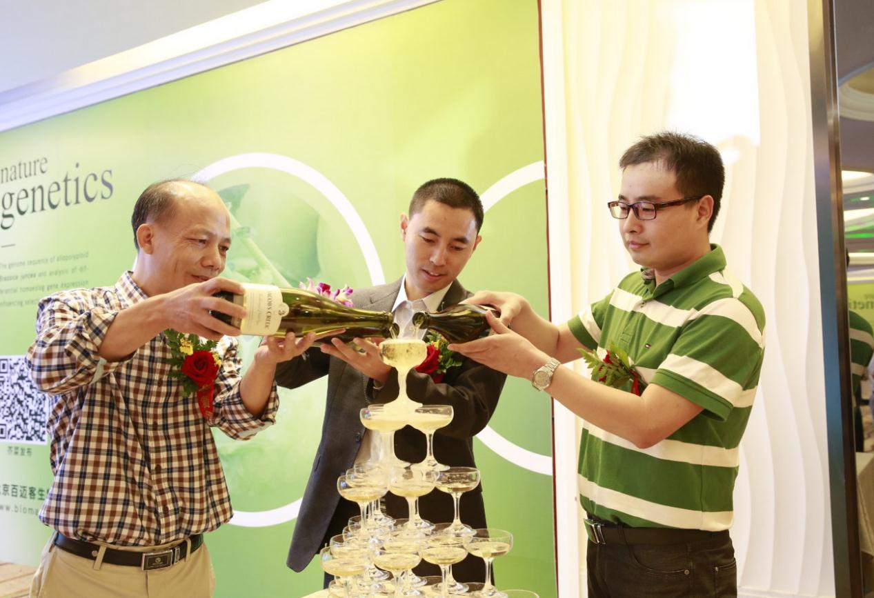 會中,眾嘉賓同時為發(fā)布會揭幕,迎來全場嘉賓們的矚目及掌聲,制作精美的大型雜志模型浮現(xiàn),同時芥菜基因組數(shù)據(jù)全球同步發(fā)布。接下來中國農(nóng)科院王曉武教 授、百邁客鄭洪坤總裁、浙江大學(xué)楊景華教授一起澆注香檳塔。于軍老師等嘉賓隨后一同舉杯,共同祝賀蕓薹屬科研成果的發(fā)布。會上有二十幾家媒體到場,媒體提 問環(huán)節(jié)也十分引人注目,cctv4、科技日報(bào)提出了百姓關(guān)注的餐桌問題;測序中國、生物探索、生物谷行業(yè)媒體就兩篇論文的基因組發(fā)布技術(shù)和潛在的應(yīng)用前景 與嘉賓進(jìn)行探討,嘉賓們紛紛做了精彩的回答。
