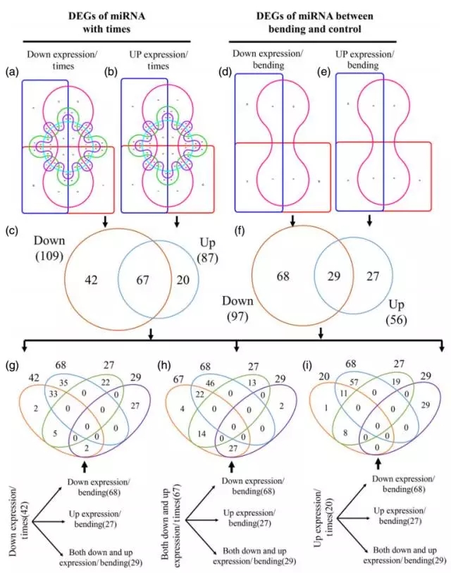對同一處理不同發(fā)育時期樣品間(CMS vs CES, CLS vs CMS, CLS vs CES, BMS vs BES, BLS vs BMS and BLS vs BES)篩選了差異表達miRNA并繪制了維恩圖。結(jié)果顯示,其中42個miRNA下調(diào)表達,20個miRNA上調(diào)表達。對不同處理相同發(fā)育時期樣品間(BES vs CES, BMS vs CMS and BLS vs CLS)篩選到124個差異表達miRNA,相對對照組,嫩枝彎曲處理組中68個下調(diào)表達,27個上調(diào)表達。