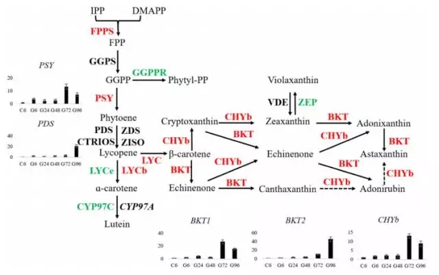 在轉(zhuǎn)錄組測(cè)序結(jié)果中,發(fā)現(xiàn)MEP通路中的8個(gè)基因都被鑒定到,但是在MVA通路中只有2個(gè)基因被檢測(cè)到,其中HMG表達(dá)不顯著,ACAT表達(dá)量下降。這些結(jié)果表明小球藻中蝦青素的合成通路中IPP和DMAPP是MEP通路合成的。其中,發(fā)現(xiàn)一個(gè)可能編碼β-胡蘿卜素激酶(BKT2)與數(shù)據(jù)庫中的BKT1比對(duì)率僅為56%。功能分析發(fā)現(xiàn)BKT2可以轉(zhuǎn)化β-胡蘿卜素成為角黃素。下圖為蝦青素合成通路圖。在葡萄糖處理情況下,與蝦青素合成相關(guān)的6個(gè)基因上調(diào)差異表達(dá)。在小球藻中,葡萄糖誘導(dǎo)蝦青素的合成,伴隨著BKT1,CHYb,PDS在24h內(nèi)上調(diào)表達(dá)。為研究轉(zhuǎn)錄組水平基因表達(dá)量與產(chǎn)物含量的關(guān)系,分析了5個(gè)限速基因的表達(dá)量,這些基因在葡萄糖處理72h或92h表達(dá)量達(dá)到最高,相應(yīng)的,蝦青素的積累量也在96h達(dá)到穩(wěn)定水平。