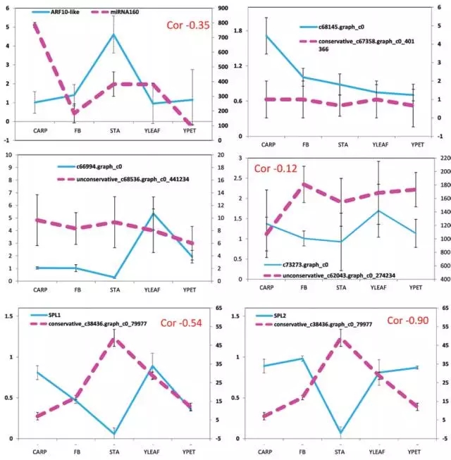 選取6個(gè)miRNA及其靶基因進(jìn)行表達(dá)驗(yàn)證,發(fā)現(xiàn)4對(duì)表現(xiàn)出負(fù)相關(guān)的關(guān)系。例如miRNA167靶向2個(gè)SPL基因,用qPCR進(jìn)行驗(yàn)證,結(jié)果顯示出強(qiáng)的負(fù)相關(guān)關(guān)系。