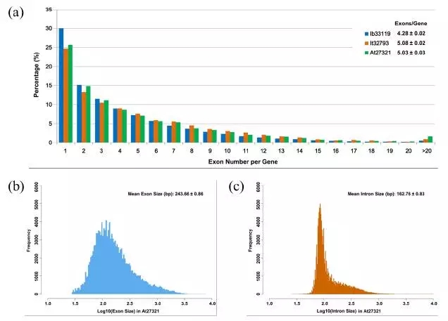 三代測序得到的全長cDNA對于研究基因的結(jié)構(gòu)非常有用,例如分析外顯子-內(nèi)含子的結(jié)構(gòu)。我們隨機挑選了50個基因進行比較,發(fā)現(xiàn)這些基因含有的外顯子數(shù)目在甘薯、野生甘薯和擬南芥三個植物中的分布是相似的。
