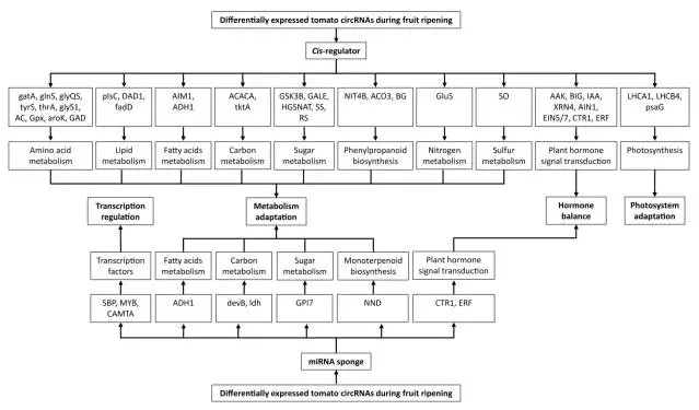 為了進一步揭示circRNA在果實成熟中的作用,我們對circRNA靶向的miRNA以及miRNA的靶標mRNA進行了預測。結果發(fā)現(xiàn)其中20個circRNA上含有7個miRNA結合位點,同時鑒定出94個miRNA的靶標mRNA。通過對鑒定到的94個靶標mRNA進行GO富集和KEGG分析,總結出circRNA可能通過調節(jié)代謝過程、激素平衡以及光合相關的通路來調控番茄果實成熟。此外,circRNA還可能通過參與轉錄調控,主要是通過調節(jié)包括ERF、SBP、MYB等果實成熟相關的轉錄因子,來調節(jié)番茄果實的成熟。