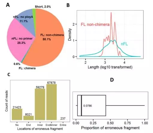 共獲得802,358個(gè)ROIs序列,其中有1.466,034全長(zhǎng)非嵌合(FL)序列和316,000非全長(zhǎng)(nFL)序列。