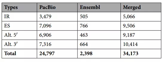 PacBio鑒定到多達(dá)24,797個(gè)AS事件,并對(duì)這些可變剪接進(jìn)行分類統(tǒng)計(jì)(Table 1),在兔的參考基因組中僅發(fā)現(xiàn)2,398個(gè)AS事件,將數(shù)據(jù)合并后共得到34,173個(gè)AS事件,且可變剪接事件包含不同的4中類型,另外,鑒定到11,184個(gè)APA事件。挑選5個(gè)基因,并用圖表示出不同的isoform比對(duì)到參考基因模型上(Figure 2)。