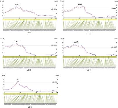 共定位到了26個和珍珠品質相關的QTL,分別位于第1,4,8,14,15和17號連鎖群上,PVE范圍為8.45%-22.8%。在1號連鎖群上定位到3個殼寬QTLs,在第1和第15號連鎖群上分分別定位到1個控制殼重的QTL。第8號染色體上定位到體重相關的7個QTL,另外,作者也定位到了大量其他性狀的QTL。同時對第17號染色體上的4個和貝殼珍珠層顏色相關的QTL進行簡單的統(tǒng)計驗證。