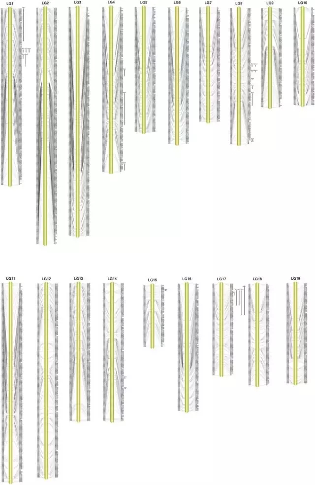 作者之前利用SSR標記做的遺傳圖譜和利用SLAF-seq構建的遺傳圖譜進行了比較。兩張遺傳圖譜均構建了珍珠蚌19條連鎖群,但是標記數(shù),圖距,分辨率均不同。SSR標記包含了506個標記,總圖距1,922.3cM,平均圖距3,99cM,大的Gap數(shù)較多,而基于SLAF-seq的圖譜在以上指標上均顯著優(yōu)于SSR標記圖譜。