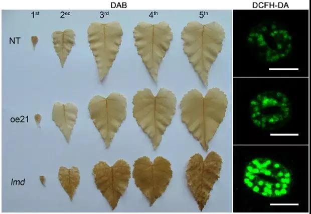 作者在研究BpGH3.5在樺樹中的功能時偶然獲得了lmd突變體。構(gòu)建的21株OE-GH3.5株系中,唯獨lmd葉片表現(xiàn)出壞死斑點并伴有早衰的現(xiàn)象。這很明顯是一種病變的表現(xiàn),當(dāng)這種情況出現(xiàn),很顯然我們要思考兩個問題: