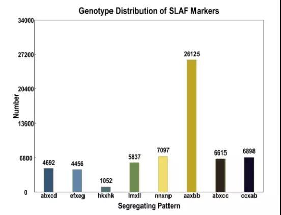 生物信息學(xué)分析,父本產(chǎn)生249076個(gè)SLAF標(biāo)簽,母本產(chǎn)生279416個(gè)SLAF標(biāo)簽,平均深度分別為32.62×和20.53×。對(duì)于F1作圖群體,每個(gè)個(gè)體平均產(chǎn)生190361個(gè)SLAF標(biāo)簽,平均深度為8.80×。其中62772個(gè)多態(tài)性SLAF標(biāo)簽用于基因分型(圖1)。除aa×bb類36647個(gè)SLAF標(biāo)記被用于圖譜構(gòu)建,適合F1群體的后期連鎖圖譜構(gòu)建,有效多態(tài)性率為7.99%。