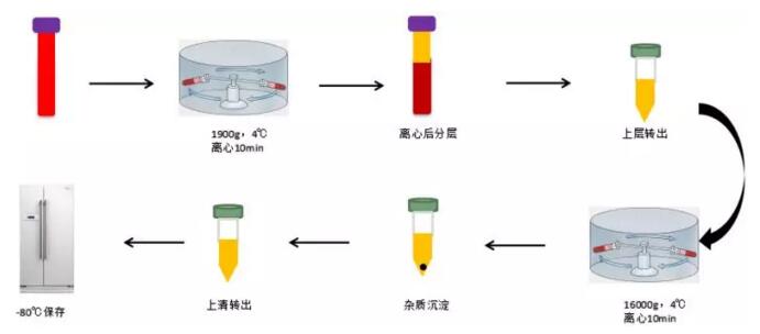 使用EDTA抗凝管采集血液樣品(采集后的血液樣品可置于室溫或4℃短暫保存,但不得超過1h)。1900g(或3000rpm),4℃,離心10min。小心轉(zhuǎn)移上層血漿(黃色)至新的1.5ml離心管中,槍頭不要觸碰中間層(白細(xì)胞和血小板層)。一般情況下,10ml的血液可分離出4-5ml血漿。將分離出的血漿16000g,4℃,離心10min。槍頭不要觸碰到管底一側(cè)的雜質(zhì),小心轉(zhuǎn)移上清到一個新的1.5ml離心管中,-80℃保存。大體積干冰運輸。