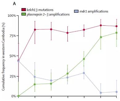 研究人員通過對來自于東南亞的1492例惡性瘧原蟲樣本的基因組序列數(shù)據(jù)分析,其中包括2007至2013年間在柬埔寨西部收集的464個惡性瘧原蟲樣本,耐藥性的不同流行病學起源通過對Kelch13青蒿素耐藥基因座和plasmepsin 2-3 哌喹耐藥基因座的單倍型分析進行鑒別。最終確定了30多個獨立的青蒿素耐藥性起源,其中91%為KEL1譜系(140/154)為耐受雙氫青蒿素哌喹抗性的寄生蟲。2008年,KEL1譜系和與哌喹抗性相關PLA1譜系相結(jié)合。2013年,KEL1/PLA1 結(jié)合譜系在柬埔寨西部頻率達到63%(24/38),并已蔓延至柬埔寨北部。
