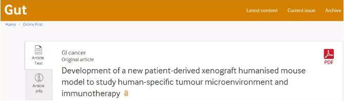 參考文獻(xiàn):Development of a new patient-derived xenograft humanised mouse model to study human-specific tumour microenvironment and immunotherapy. Gut. 2018 Mar 30.