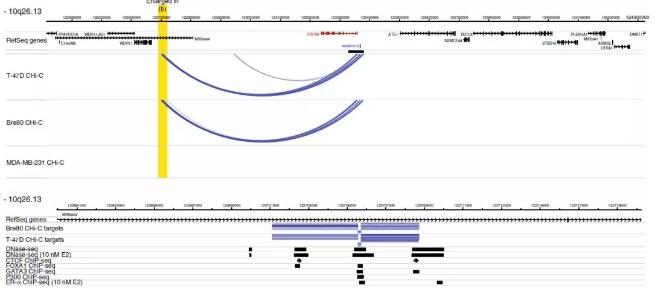 互作peak示例:下圖為10q26.13基因座的互作peak(loop),在ER+乳腺癌細胞系和正常乳腺上皮細胞系中鑒定到了互作peak,但是ER-乳腺癌細胞系中則未檢測到?;プ靼谢虻霓D(zhuǎn)錄起始位點(TSS)位于捕獲區(qū)域內(nèi),并且和相距幾百Kb遠的特異的HindIII酶切片段形成環(huán)(互作Peak)。在T-47D細胞系中,這些遠距離片段與DNase I超敏位點、CTCF、FOXA1、GATA3轉(zhuǎn)錄因子結(jié)合位點以及雌激素受體ERα結(jié)合位點共定位。