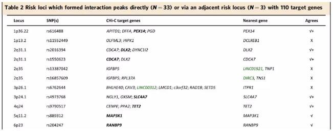 作者將靶基因定義為至少兩個細胞系中,定位到捕獲區(qū)域內(nèi)或捕獲區(qū)域的順式作用區(qū)間(≤5 Mb)的基因,且其轉(zhuǎn)錄起始位點/TSS定位在相互作用片段上。以此為準能夠為51個基因座中的33個(64.7%)鑒定到110個推定的靶基因,其中94個為蛋白編碼基因,16個非編碼RNA。作者比較了GWAS風(fēng)險SNP位點的臨近基因以及本研究中鑒定到的靶基因,發(fā)現(xiàn)其中24個基因座的鄰近基因是唯一的CHi-C靶基因(N = 9)或幾個CHi-C靶基因之一(N = 15)。