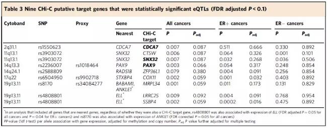 為了評估推定的靶基因在乳腺癌病因中具有因果作用的可能性,作者首先使用風(fēng)險SNP(或與風(fēng)險SNP連鎖不平衡的位點,r2> 0.8)和TCGA數(shù)據(jù)庫中的RNA-Seq數(shù)據(jù)(N=547)進行eQTL分析( TCGA),并對匹配的DNA甲基化數(shù)據(jù)和體細胞拷貝數(shù)變異進行了校正,根據(jù)ER狀態(tài)進行分層分析。共計鑒定到了22個顯著SNP-基因組合(t檢驗p<0.05),其中9個經(jīng)過多重檢驗FDR校正后仍然顯著。其中,3個基因為鄰近基因。