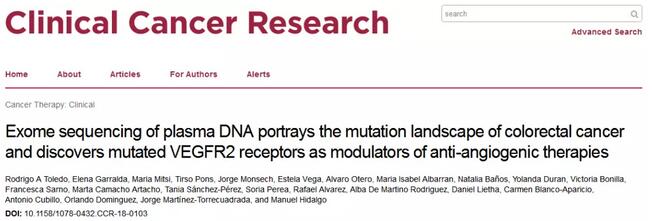 參考文獻:Toledo R A, Garralda E, Mitsi M, et al. Exome sequencing of plasma DNA portrays the mutation landscape of colorectal cancer and discovers mutated VEGFR2 receptors as modulators of anti-angiogenic therapies[J]. Clinical Cancer Research, 2018: CLIN CANCER RES. 0103.2018.(IF=9.619)