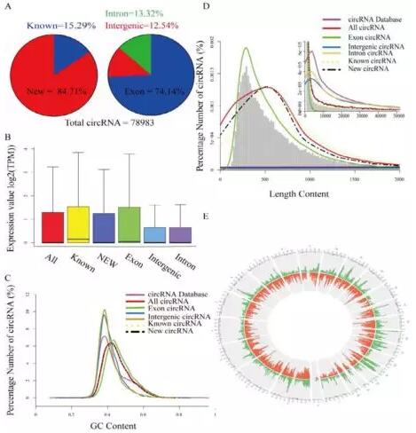 所有circRNA和外顯子circRNA的GC含量高于circRNA數(shù)據(jù)庫,但內含子和基因間區(qū)circRNA的GC含量與circRNA數(shù)據(jù)庫中相似(圖2c)。此外,circRNA長度的峰值主要集中在558 bp區(qū)域,而在數(shù)據(jù)庫中circRNA的峰值則集中在4105 bp區(qū)域。新circRNA與已知的circRNA長度具有相似的特征,表明新circRNA數(shù)據(jù)是可靠的(圖2d)。圖2e顯示了circRNA在人類染色體上的基因分布,circRNA也廣泛分布于所有的染色體中,但在Y染色體和著絲粒上的分布較少,在每條染色體的染色體臂兩端有較高的分布。