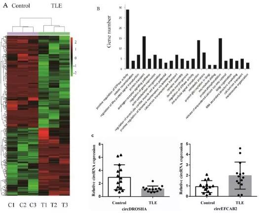 在本研究中,為了評估circRNA在人體內的作用,作者采用了高通量測序方法,測定TLE患者和非TLE患者顳葉新皮質中circRNA表達水平,并對環(huán)狀RNA的功能進行了注釋。作者描述了一個包含潛在基因與circRNA-miRNA的網(wǎng)絡。