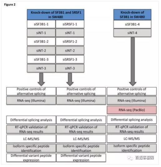 為了驗證能通過splicify得到的isoform,同時增加新的轉(zhuǎn)錄本,Iso-seq被用于在SW480細胞中SF3B1的下調(diào)和siNT對照(如圖2所示)的檢測中。