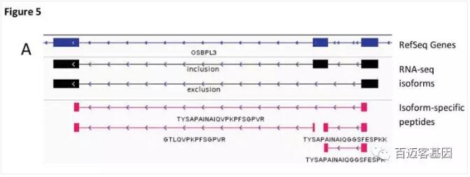 約65%的顯著差異表達的splice-specific-peptides在RNA水平上表現(xiàn)出一致的表達差異。例如,下調(diào)SF3B1的實驗組中,OSBPL3 9號外顯子中分別有3個支持外顯子保留和1個支持外顯子去除的peptides被鑒定出來。兩種inclusion specific-peptides表達明顯較低,而exclusion specific -peptides則與對照相比表現(xiàn)出較高的表達量(如圖5所示)。