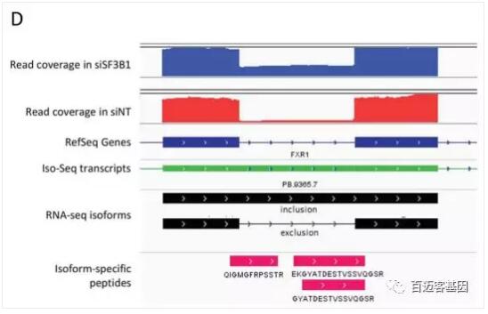 例如,全長轉(zhuǎn)錄本進行測序結(jié)果支持FXR1內(nèi)含子保留的三種肽段,因此這種內(nèi)含子保留事件也存在于注釋文件中。Illumina 測到的短 reads支持這一事件,并提供了定量的證據(jù),表明它在SF3B1的下調(diào)過程中比其對照組(圖6D)更高表達。