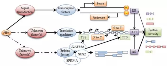 FY Zhu[3]等通過轉(zhuǎn)錄組和蛋白組的聯(lián)合分析揭示了擬南芥在脫落酸響應(yīng)中的可變剪接和翻譯的分子機(jī)制,結(jié)果中發(fā)現(xiàn)相比于基因的差異表達(dá),發(fā)生差異可變剪接的基因功能多集中在三羧酸循環(huán)、光合作用等途徑,表明在對(duì)ABA響應(yīng)中,相對(duì)基因表達(dá),轉(zhuǎn)錄本的結(jié)構(gòu)變化可能起更為重要的作用,且差異可變剪接事件更容易翻譯成蛋白行使生物學(xué)功能。