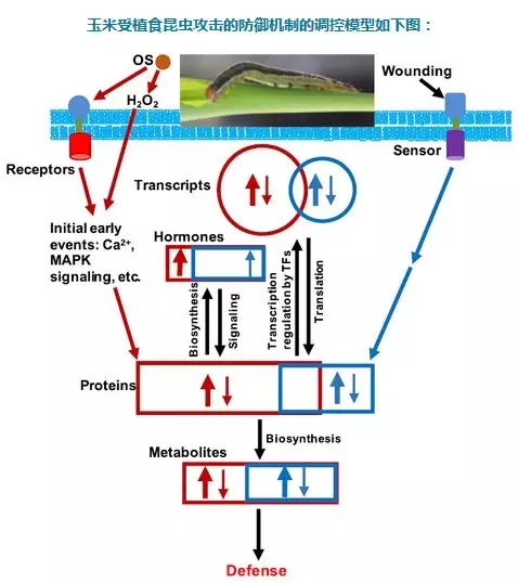 Qi J[4]等,利用多組學(xué)(轉(zhuǎn)錄組學(xué)、蛋白組學(xué)、代謝組學(xué))技術(shù),探索了玉米受植食昆蟲攻擊的防御機(jī)制,并構(gòu)建繪制了系統(tǒng)的調(diào)控模型。這些數(shù)據(jù)對(duì)玉米防御昆蟲災(zāi)害的進(jìn)一步遺傳學(xué)研究搭建了很好的框架,也為抗昆蟲災(zāi)害的玉米新品種的培育奠定了良好的基礎(chǔ)。