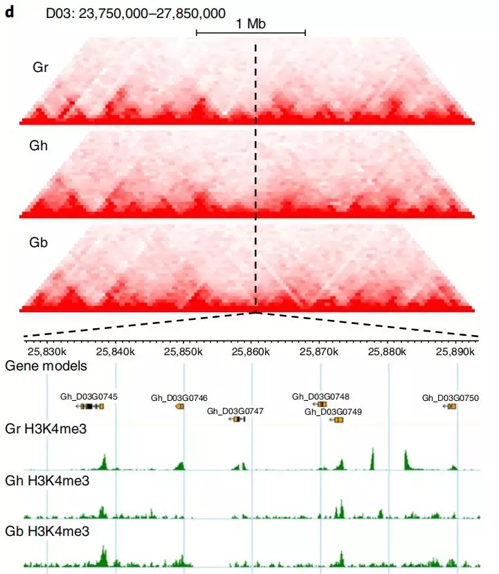 例如,在棉花的三維基因組進化文章中,作者對二倍體雷蒙德氏棉、二倍體亞洲棉、四倍體陸地棉和四倍體海島棉構建了三維基因組圖譜,與雷蒙德氏棉D03染色體相比,陸地棉和海島棉對應的D亞基因組中發(fā)生了染色質重排,虛線對應的TAD結構發(fā)生了變化,雷蒙德氏棉中該TAD結構完整,存在明顯的邊界,陸地棉中該邊界發(fā)生了左移,而海島棉中該TAD趨向于消失。因而通過鑒定TAD發(fā)生變化區(qū)域的基因,可以研究多倍化過程中基因表達調控的改變(研究多倍體的老師們,這可是一個很好的套路文章哦)。同時結合ChIP-seq數(shù)據(jù)對該TAD邊界進行分析發(fā)現(xiàn),雷蒙德氏棉富含豐富的H3K4me3(活性染色質標記),而陸地棉和海島棉中H3K4me3顯著減少,說明在棉花的多倍化與表觀遺傳修飾存在密切關聯(lián)。