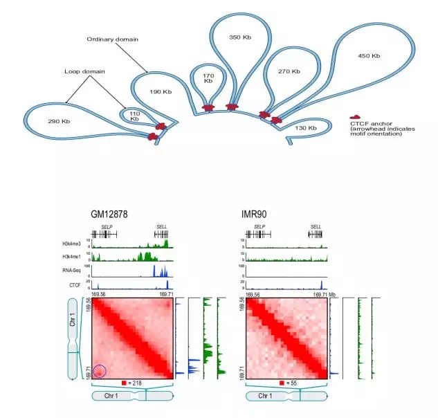 例如,在人的loop文章中,作者在GM12878細胞系發(fā)現(xiàn)9448個loop,其中2854個loop與已知的啟動子-增強子作用相關,基因的啟動子存在loop比不存在loop時的表達量顯著增加。GM12878細胞系中存在一個Loop,這個Loop連接了SELL啟動子和一個遠端增強子SELP,基因開啟轉錄,表達量增加,而IMR90細胞系中沒有這個Loop,基因不表達。