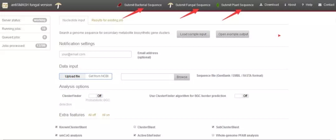 1.次級代謝產(chǎn)物預(yù)測網(wǎng)址:https://fungismash.secondarymetabolites.org ,點擊進入界面,可進行細菌、真菌以及植物次級代謝產(chǎn)物預(yù)測;