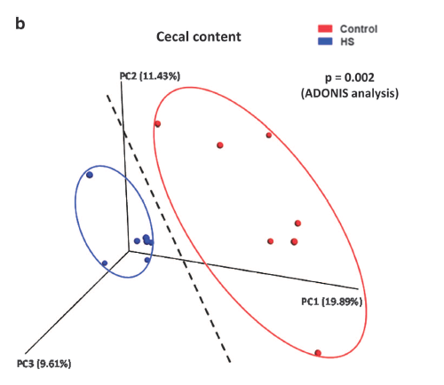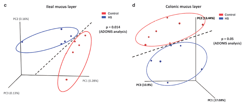16S rRNA測序表明, HS組的盲腸內(nèi)容物(cecal content)菌群組成與對照小鼠相比,在門和綱水平上明顯不同。特別是在HS處理后,盲腸內(nèi)容物中放線菌門和厚壁菌門中的Actinobacteria、Firmicutes和Bacteroidetes以及綱水平中的Actinobacteria,Clostridia和Bacteroidia所占比例顯著改變。使用未加權(quán)的uniFrac分析的主坐標(biāo)分析(PCoA)顯示,HS組和對照組盲腸內(nèi)容物菌群分別聚類(P = 0.002,ADONIS分析)。粘膜細(xì)菌也是影響腸道病理生理狀態(tài)的重要因素,回腸粘膜( ileal mucosa)和結(jié)腸粘膜(colonic mucosa)在整個胃腸道中的細(xì)菌數(shù)量最多。因此,進(jìn)一步分析了位于回腸粘膜層和結(jié)腸粘膜層的細(xì)菌。未加權(quán)的uniFrac分析顯示,HS組和對照組在回腸粘液層分別聚類(P = 0.014,ADONIS分析)。而在結(jié)腸粘液層,對照組和HS組也形成兩個聚類類別,分離趨勢明顯(P =0.05,ADONIS分析)。