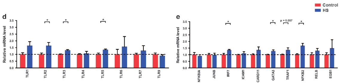 通過二代測序進(jìn)行轉(zhuǎn)錄組測序分析,比較對照組和HS組之間涉及“細(xì)胞因子-細(xì)胞因子受體相互作用”、“NF-κB信號通路”和“Toll樣受體信號通路”的所有相關(guān)基因的表達(dá)。結(jié)果表明回腸和結(jié)腸中,兩組之間許多基因的表達(dá)存在差異。