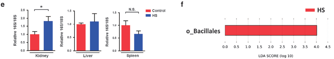 腸道通透性增加可能導(dǎo)致腸道細(xì)菌或細(xì)菌產(chǎn)物易位至腸外組織。通過使用16s PCR來識別細(xì)菌DNA,檢測腎臟、肝臟和脾臟中的細(xì)菌易位。有趣的是,慢性HS攝入促進(jìn)了細(xì)菌易位進(jìn)入腎臟,但不會進(jìn)入肝臟或脾臟。LEfSe試驗(yàn)結(jié)果表明,與對照組相比,HS處理的腎臟中富含屬于腸道細(xì)菌的桿菌。與對照動物的腎臟相比,在HS喂養(yǎng)的腎臟中,芽孢桿菌(Bacillus)和游動微菌(Planomicrobium)分別增加了2.6倍和8.7倍。