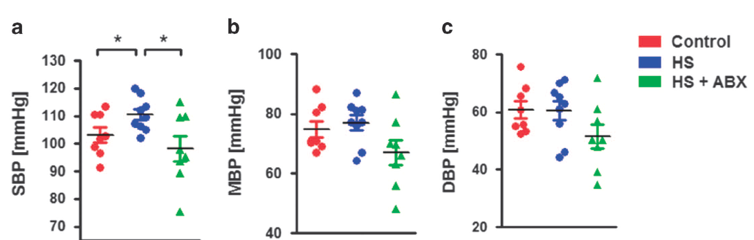 慢性HS喂養(yǎng)可能導(dǎo)致動脈壓升高。 雖然HS處理的小鼠的舒張壓(DBP)和平均血壓沒有增加,但收縮壓(SBP)在慢性HS喂養(yǎng)后顯著升高。有趣的是,抗生素治療能夠完全恢復(fù)正常SBP。這些數(shù)據(jù)強(qiáng)烈表明,慢性HS喂養(yǎng)引起的SBP升高取決于腸道微生物菌群。