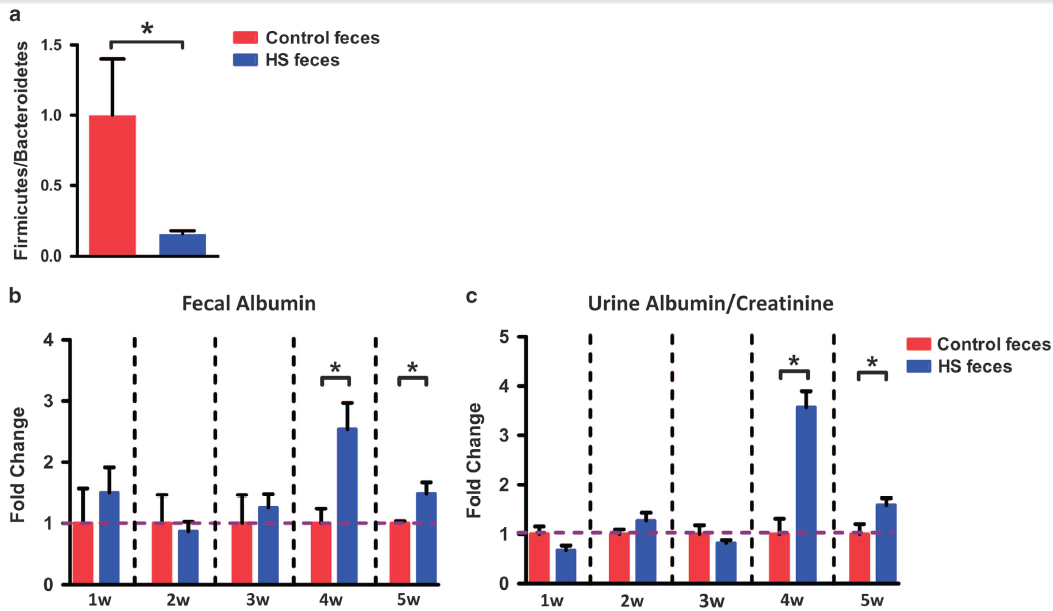 糞便微生物菌群移植實(shí)驗(yàn):喂食正常飲食的兩組小鼠口服來自對照和HS處理的小鼠的糞便。移植8周后,接受對照糞便的對照小鼠中的微生物菌群組成改變的主要標(biāo)記物–盲腸厚壁菌/擬桿菌比例明顯高于接受HS糞便的小鼠,這一點(diǎn)與作者之前的數(shù)據(jù)一致,表明HS喂養(yǎng)會降低盲腸中的厚壁菌 / 擬桿菌比例,并說明了糞便微生物菌群移植實(shí)驗(yàn)是成功的。給藥4周后,糞便白蛋白含量檢測結(jié)果表明,接受HS喂養(yǎng)糞便的小鼠的腸通透性顯著增加。并且,尿白蛋白(albumin)/肌酸酐(creatinine)比率(在當(dāng)前研究中觀察到的腎功能障礙的主要表型),在移植4周后接受HS喂養(yǎng)的糞便的小鼠中也顯著增加。最后,與對照小鼠相比,HS糞便移植小鼠中的腎臟凋亡細(xì)胞數(shù)量顯著增加。