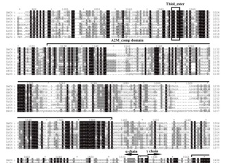 多重序列比對表明,硬骨魚和人的氨基酸高度保守。推導出的S.m-C4蛋白具有α-β連接子序列RXXR(在殘基668-671)和α-γ。連接序列RRXR(殘基1426-1429),其中C4氨基酸鏈被切割成三個鏈(α,β和γ鏈)。此外,保守的硫酯(GCGEQ)位點也定位在殘基1001至1005(圖5)。預測了TLR5由前21個氨基酸組成的信號肽和由14個氨基酸組成的跨膜螺旋。在膜結(jié)合型TLR5的LRR-CT中發(fā)現(xiàn)4個保守的半胱氨酸殘基,此外,還有9個蛋白結(jié)合區(qū)。結(jié)果表明,S.m-TLR5蛋白與銀大麻哈魚(91.5%)、大西洋鮭(91.7%)和衰白鮭(89.6%)的同源性較高,與鯉魚(48.1%)和金鯽(48.8%)的同源性較低。