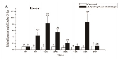 為探討這兩種免疫基因在細菌侵入的免疫應答,采用定量實時PCR(qPCR)技術(shù),觀察注射后96h內(nèi)肝、脾臟相關(guān)基因的表達。對于鹽水處理組,即對照組,S.m-C4基因在研究的所有時間點肝臟中均無顯著差異(圖9)。對于嗜水氣單胞菌注射組,即實驗組,肝臟在24小時有顯著增加(p=0.04),在12小時和72小時出現(xiàn)兩個峰值,邊緣顯著。在6h、12h、24h和72h,實驗組與對照組有顯著性差異。對照組脾臟中S.m-C4基因的相對表達上下波動,8個時間點之間差異不顯著,實驗組脾臟中S.m-C4基因的相對表達除72h外,其余時間點均無差異,與細菌注射組0 h相比減少59.6%。