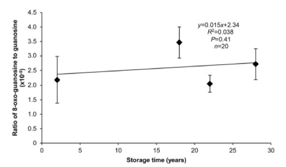 來(lái)自5’末端的轉(zhuǎn)錄本降解可以反映年齡相關(guān)的RNA氧化。最容易氧化的堿基,8-oxo-guanosine的豐度與總RNA中鳥苷豐度的比例與1989,1995,1999和2015年收獲的大豆種子胚軸的貯藏時(shí)間無(wú)關(guān)(圖5)。