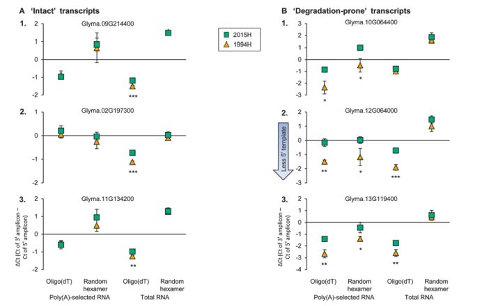 通過(guò)qPCR的方法對(duì)區(qū)域A(無(wú)降解)的三種轉(zhuǎn)錄本和區(qū)域B的三種轉(zhuǎn)錄本(僅在1994H種子組織中顯著降解)的完整性進(jìn)行驗(yàn)證,結(jié)果顯示:區(qū)域A的轉(zhuǎn)錄本,在組內(nèi)cDNA文庫(kù)中5’和3’擴(kuò)增的cDNA模板相似,且三個(gè)cDNA文庫(kù)ΔCt值沒(méi)有差異,樣本2015H和1994H之間有較小差異。與完整轉(zhuǎn)錄本相反,對(duì)于易于降解的轉(zhuǎn)錄本,ΔCt值在群組之間顯著不同(區(qū)域B)。在1994H樣品中,5’比3’擴(kuò)增模板豐度低,產(chǎn)生負(fù)ΔCt值,在2015H樣品中,兩種擴(kuò)增模板豐富度相似。