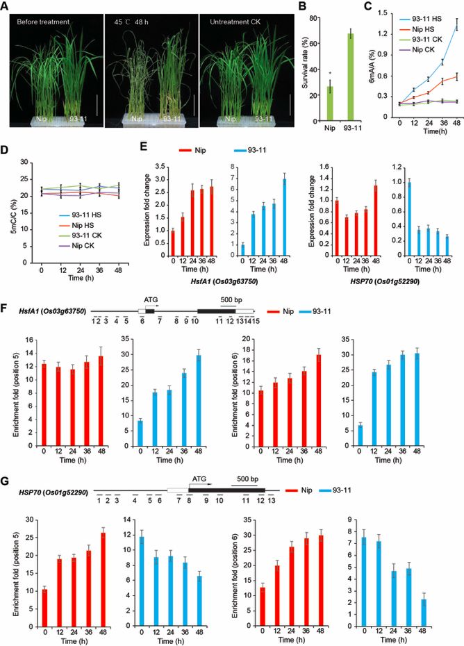 根據(jù)SMRT測(cè)序結(jié)果,篩選出候選的6mA修飾的熱脅迫相關(guān)基因,如熱休克轉(zhuǎn)錄因子A1(HsfA1)和熱休克蛋白70(HSP70)。HSFA1是熱脅迫反應(yīng)的主要轉(zhuǎn)錄調(diào)控因子,其在非脅迫條件下受到HSP70的抑制。HSFA1功能缺失導(dǎo)致熱脅迫敏感表型。HsfA1HSP70表達(dá)的變化與其6mA水平的變化呈正相關(guān),這可能是Nip和93-11之間熱脅迫耐受性差異的原因。