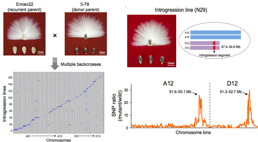 通過(guò)研究發(fā)現(xiàn)了在陸地棉(G.?hirsutum?acc. TM-1)和海島棉(G. barbadense?acc. 3-79)間存在廣泛的遺傳變異,進(jìn)一步推測(cè)這些變異的一部分可能是造成表型差異的原因,包括纖維性狀。為了利用這些變異進(jìn)行定向育種,研究人員構(gòu)建了一個(gè)漸滲系群體,旨在引入有利的變異,控制從G.barbadenseG. hirsutum等重要農(nóng)藝性狀的形成,如纖維質(zhì)量。研究人員通過(guò)分子標(biāo)記對(duì)168份漸滲系材料進(jìn)行測(cè)序,并鑒定了涵蓋所有26條染色體的466個(gè)基因滲入片段(圖6)。研究人員發(fā)現(xiàn)了在染色體D12中含有漸滲片段的漸滲系,其具有有限的絨毛纖維,類(lèi)似于其供體親本G.barbadense?3-79(圖6,圖7上),基因滲入片段的位置與無(wú)絨天然突變體G. hirsutum?Xuzhou142fl的圖譜測(cè)序所示的位置相同,然而其遺傳基礎(chǔ)以前未被充分了解(圖7下)。這些結(jié)果表明,陸地棉(G. hirsutum)中無(wú)絨毛突變體的遺傳變異與海島棉(G. barbadense)中的數(shù)量性狀基因座(QTL)共定位。該漸滲片段與天然纖維突變體的特征將有助于比較分析海島棉和陸地棉之間的絨毛纖維起始機(jī)制。