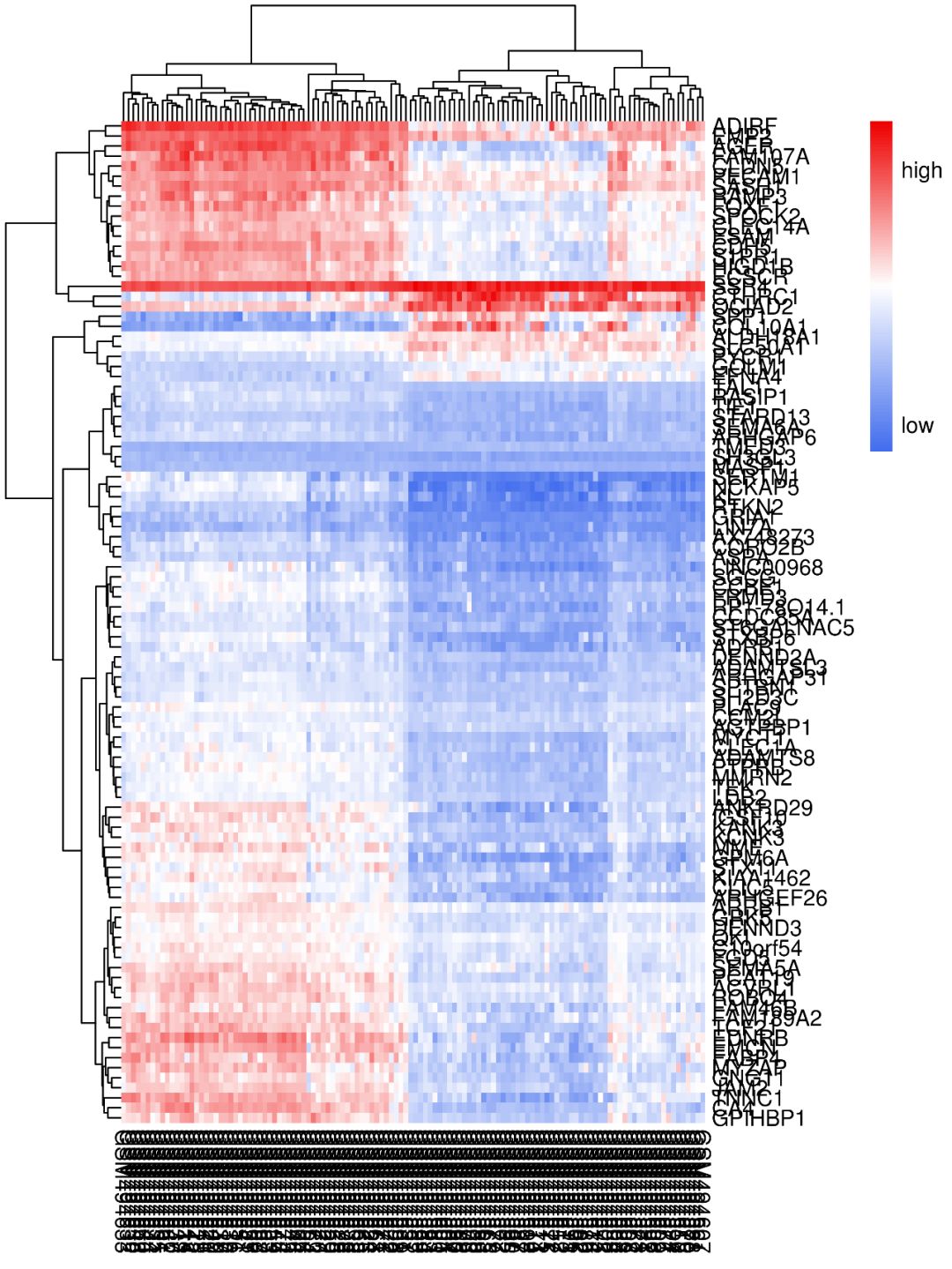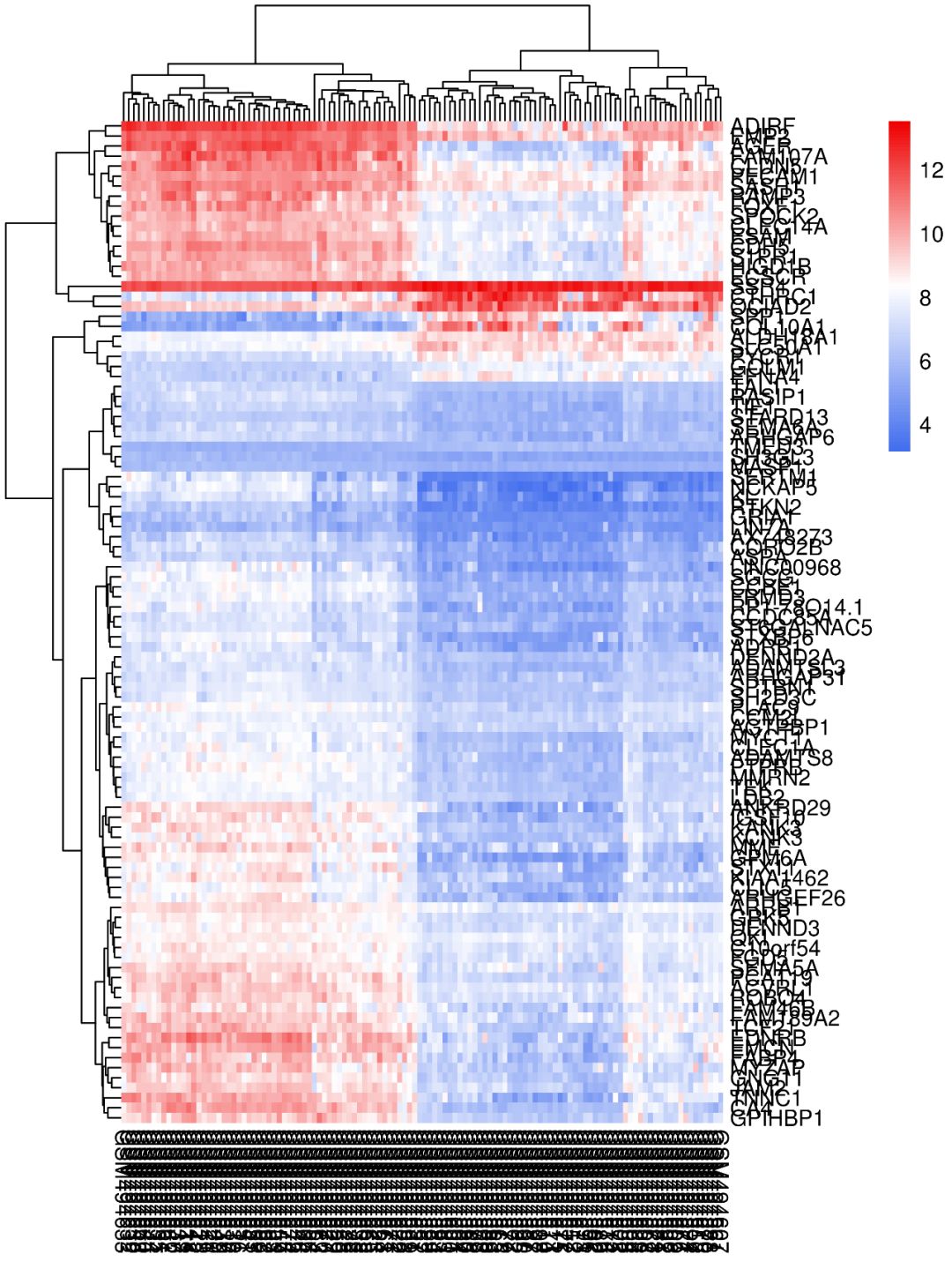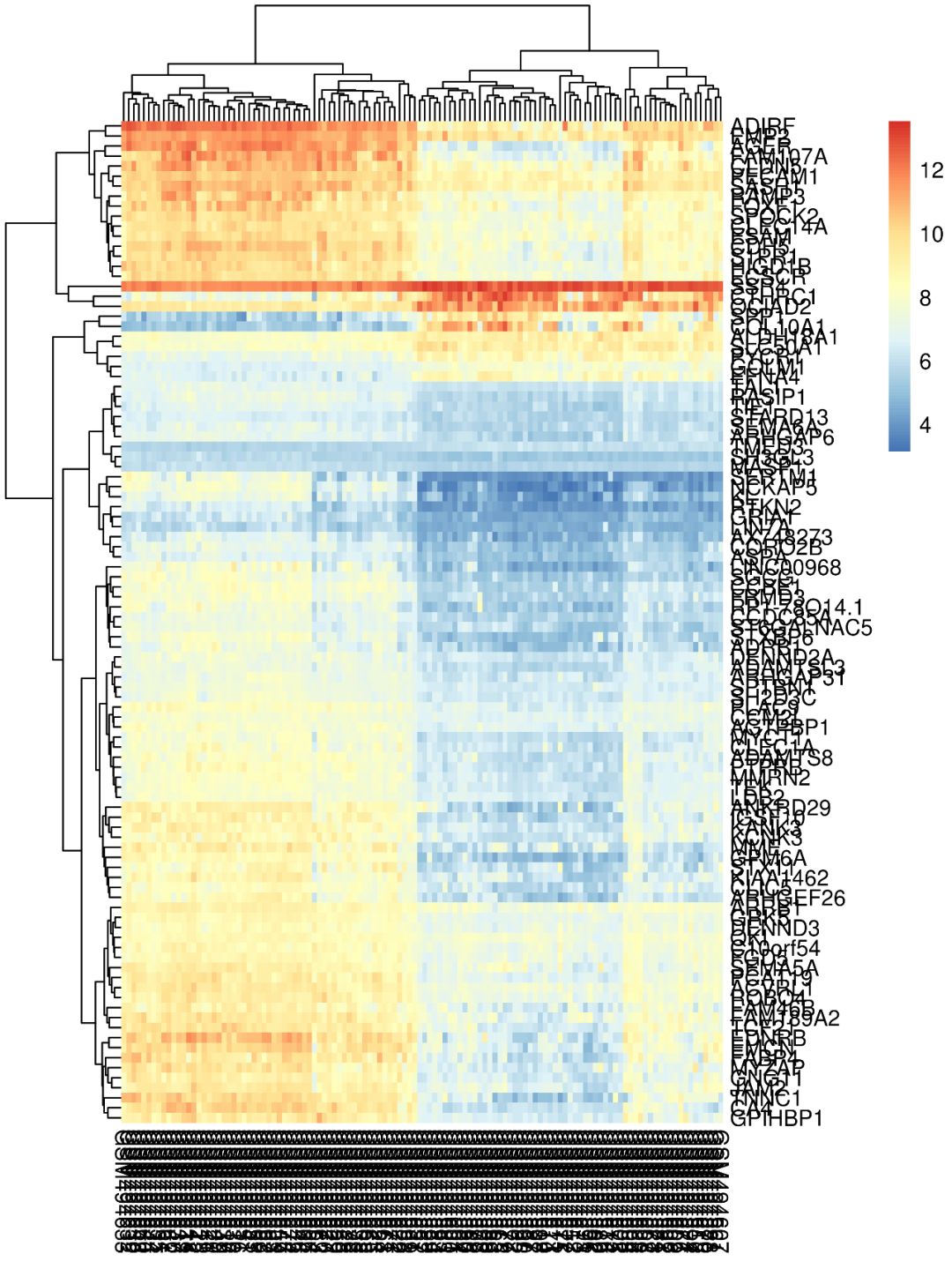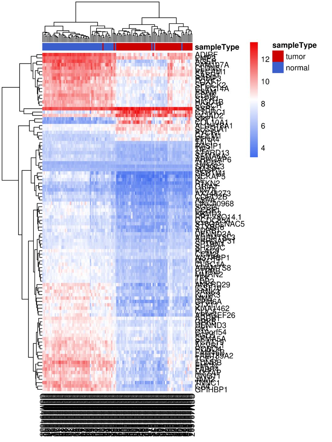 如使用默認參數(shù)畫出來的熱圖,是不是很不好看?基因名和樣本名亂成一堆,也看不出來那些樣本聚類到了一起…這類熱圖怎么做?