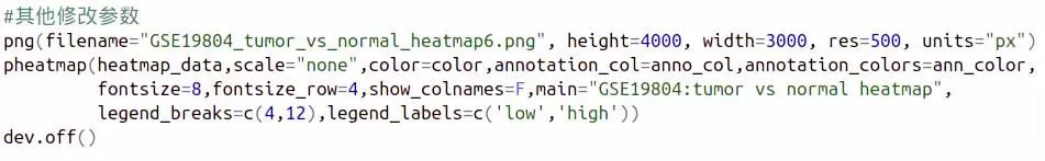 我們修改了字體大小,不顯示樣本名,以及設置圖片標題,到此時,經(jīng)過一系列參數(shù)更改,是不是已經(jīng)比一開始使用默認參數(shù)好看多了呢?(可以增加一個對比圖,GSE19804_tumor_vs_normal_heatmap6.png與GSE19804_tumor_vs_normal_heatmap1.png的 對比)。