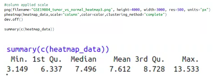我們現(xiàn)在將數(shù)據(jù)進行行均一化,聚類方法選擇complete,進行均一化之后的熱圖還沒有前面的好看,查看數(shù)據(jù)表達情況,我們發(fā)現(xiàn)最小的表達值3.149和最大的表達值13.533之間并沒有相差很大,因此這套數(shù)據(jù)其實不適合做均一化處理,畫出來的熱圖更好看。