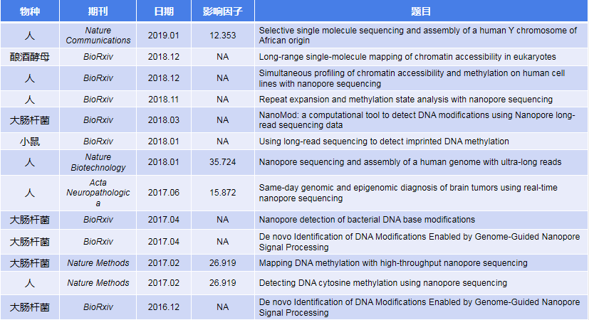 目前市場(chǎng)常用重亞硫酸鹽法檢測(cè)5mC,其√確度高,但化學(xué)處理會(huì)導(dǎo)致DNA分子的片段化、測(cè)序深度高、無(wú)法鑒定更多修飾類(lèi)型。Nanopore技術(shù)作為新一代基于納米孔的單分子實(shí)時(shí)電信號(hào)測(cè)序技術(shù),截至目前,全球范圍內(nèi)基于Nanopore平臺(tái)進(jìn)行的甲基化研究文章近10篇,見(jiàn)刊于nature methods、bioRxiv等國(guó)際知名期刊。
