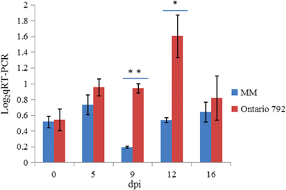 圖5. RT-qPCR分析候選基因Solyc01g007130.3的表達量(病菌侵染后)