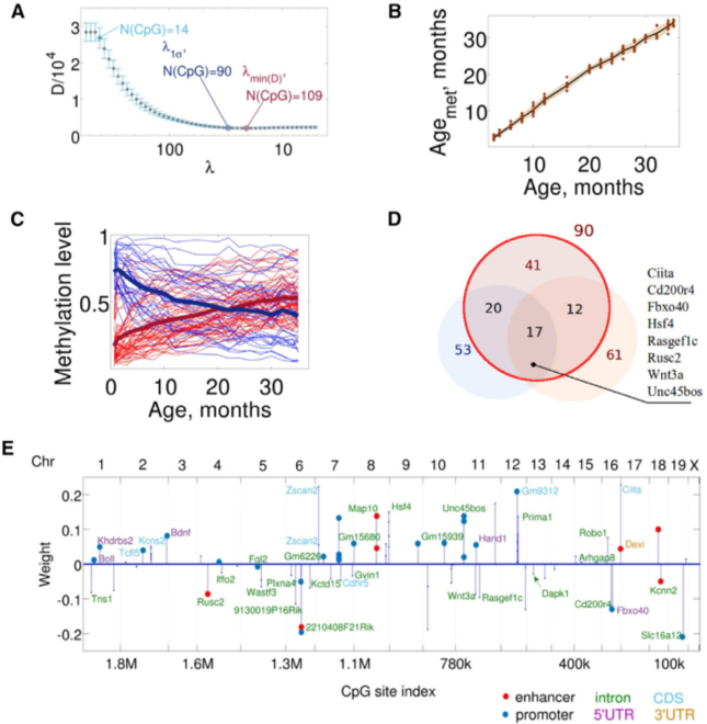 該研究對不同年齡階段的小鼠進(jìn)行RRBS研究,并找到了90個與年齡相關(guān)的CpG位點來構(gòu)建小鼠生物學(xué)年齡的預(yù)測器。這些位點的clock代表了衰老的生物標(biāo)志物,并可以用來確定生物體的生物學(xué)年齡,并進(jìn)一步干預(yù)衰老的速度。