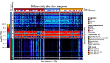 基于線性模型分析IBD微生物組的酶功能(EM)。與對(duì)照組相比,568種酶的豐度在UC或CD患者中差異顯著(FDR,q<0.05)(圖8.),其中246種酶不受任何單一菌種支配。UC和CD患者均富集有鎂離子轉(zhuǎn)運(yùn)ATP酶(EC 3.6.3.2)(圖9.a)和乙醇胺氨裂合酶(EC 4.3.1.7)(相對(duì)于對(duì)照組)(圖9.b),而乙醇胺氨裂合酶與甘油磷脂的合成有關(guān),后者在UC和CD患者的代謝物中富集最多(圖3.a)。谷胱甘肽還原酶(EC 1.8.1.7)在IBD患者中也有較高豐度(圖9.c);丙酮酸合成酶(EC 1.2.7.1)在對(duì)照組中富集,在CD患者中完全未檢測(cè)到(圖9.d);維生素B12(如前咕啉,EC 1.3.1.76)在對(duì)照組含量較高(圖9.e)。四吡咯可能是維生素B12的衍生物和相關(guān)化合物,它在LC-MS代謝組分析中普遍存在,并且在IBD患者中富集(圖4.b)。